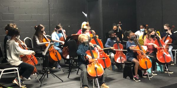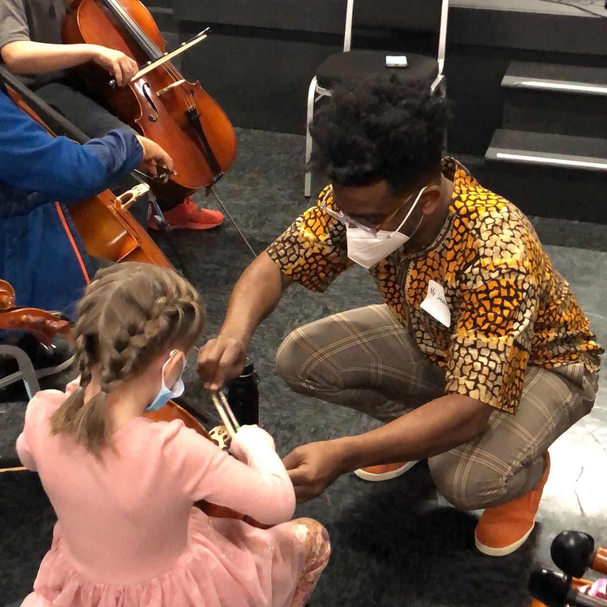 Cellist Okorie Johnson working with a young cellist at our last workshop from March 2022..